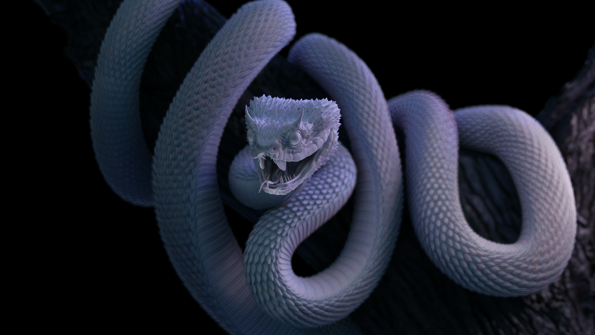 For the snake’s design, I drew inspiration from some of nature’s most flamboyant and dragon-like serpents. Its silhouette combined elements of the blue pit viper (Trimeresurus insularis), West African bush viper (Atheris squamigera), rainbow boa (Epicrates cenchria) and Saharan horned viper (Cerastes cerastes). The subtle addition of horns was a playful nod to the snake’s devilish undertones, giving a wink to its symbolic ties to Satan.