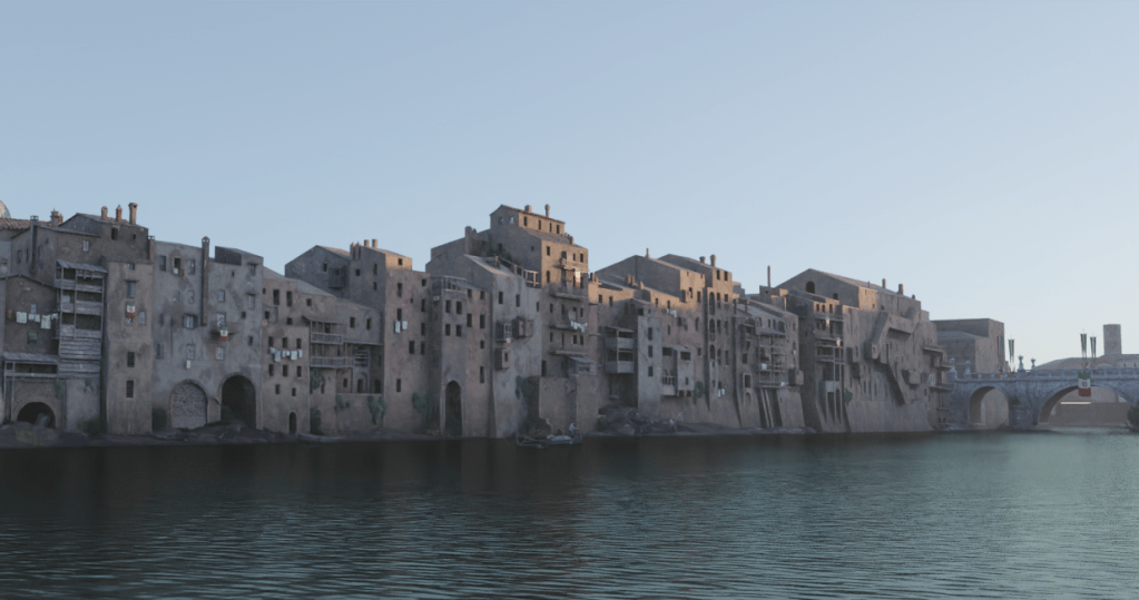 I had the privilege of working on the film, which won a David di Donatello (essentially Italy’s Academy Award) for scenography, thanks to the stunning work of Andrea Castorina. Our goal was to digitally reconstruct the Tiber harbor by Ponte Elio, aided by a practical set for the first building. It was one of my first on-set experiences, and it was truly eye-opening and fun—what a collective effort filmmaking is! My task was to set-extend Rome with a sizable CG extension, as the practical set was shot in a remote location, still along the Tiber River but near Poggio Mirteto. As a Roman and a history buff, this kind of effect was my jam!