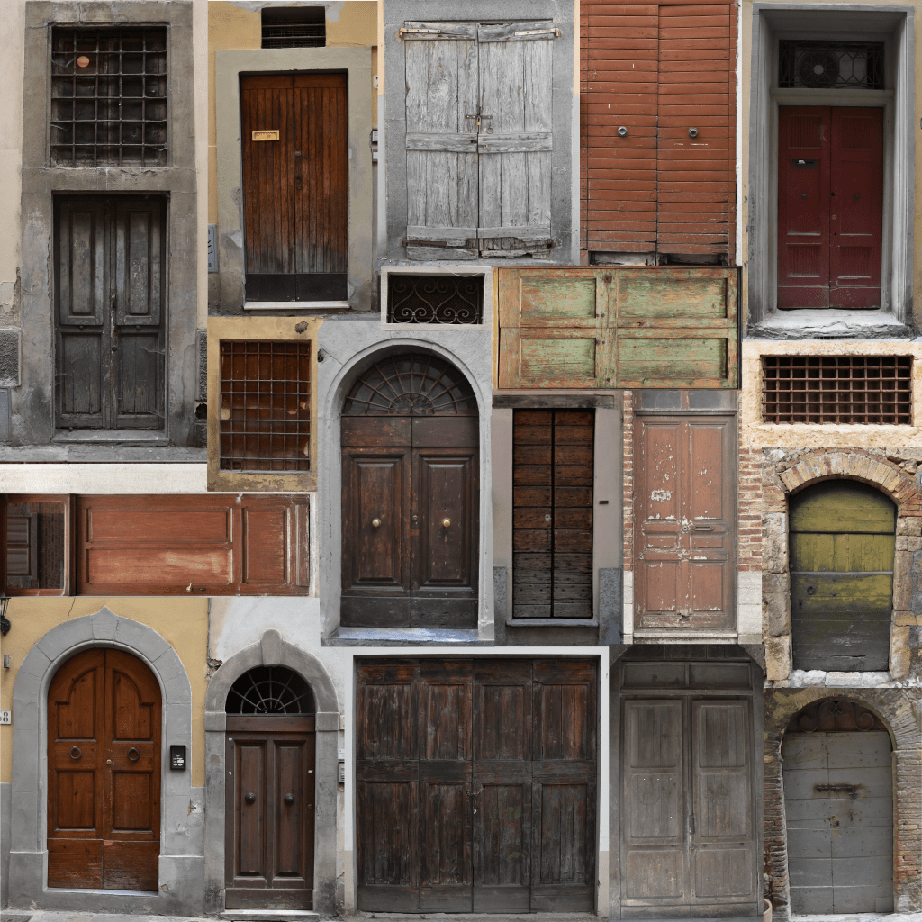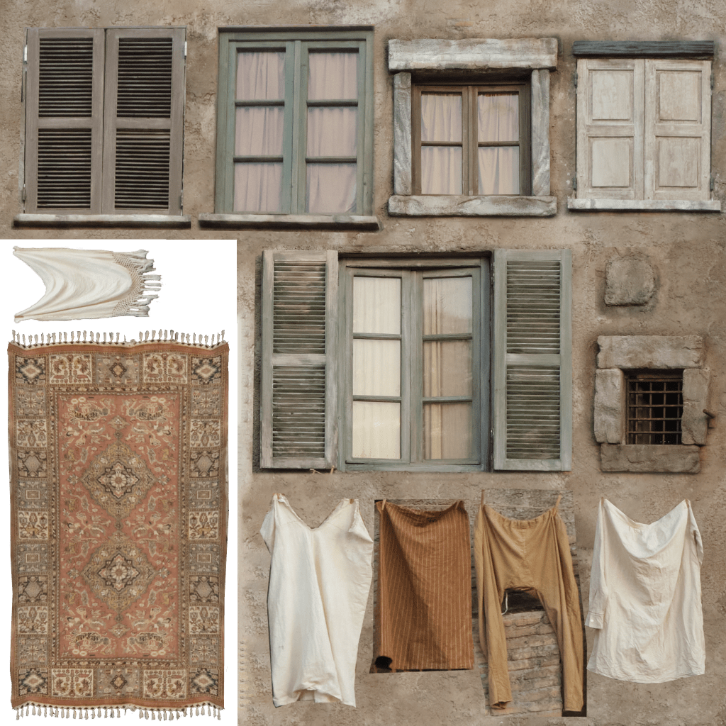 On a different note, here are some texture atlases I created using my own photos and on-set materials. This approach has been highly effective: it allows for seamless integration of CG elements with real props, and my passion for photographing historical buildings and doors has provided me with a rich library of textures to draw from.